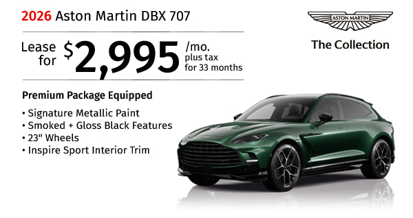 2026 Aston Martin DBX 707 Premium Package. Stock #TTV13760. MSRP $307,800. $2,995/mo. plus tax 33 months lease. $ Rebate. $35,910 Total due. Includes down payment, tax, first payment, tag, acquisition fees, dealer fee, and dealer installed options, if any. $0...Request More Info