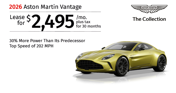 2026 Aston Martin Vantage Coupe. Stock #TGN10845. MSRP $241,515. $2,495/mo. plus tax 30 months lease. $ Rebate. $29,975 Total due. Includes down payment, tax, first payment, tag, acquisition fees, dealer fee, and dealer installed options, if any. $0 security deposit....Request More Info