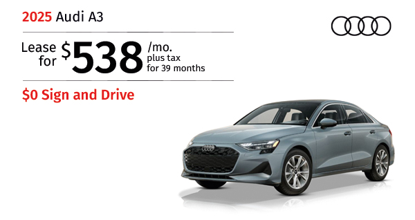 2025 Audi A3 quattro. Stock #313328. MSRP $41,990. $538/mo. plus tax 39 months lease. $1,000 Bonus cash. $0 Total due. Includes down payment, tax, first payment, tag, acquisition fees, dealer fee, and dealer installed options, if any. $0 security deposit....Request More Info