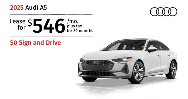 2025 Audi A5 . Stock #SN054283. MSRP $56,775. $546/mo. plus tax 39 months lease. $0 Bonus cash. $0 Total due. Includes down payment, tax, first payment, tag, acquisition fees, dealer fee, and dealer installed options, if any. $0 security deposit....Request More Info