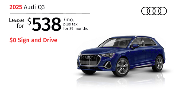 2025 Audi Q3 45. Stock #S1092602. MSRP $44,060. $538/mo. plus tax 39 months lease. $2,500 Bonus cash. $0 Total due. Includes down payment, tax, first payment, tag, acquisition fees, dealer fee, and dealer installed options, if any. $0 security deposit....Request More Info