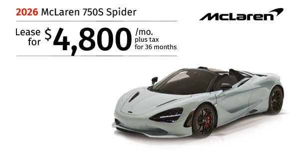 2026 McLaren 750S Spider. Stock #TW010041. MSRP $417,700. $4,800/mo. plus tax 36 months lease. $ Rebate. $37,832 Total due. Includes down payment, tax, first payment, tag, acquisition fees, dealer fee, and dealer installed options, if any. $0 security deposit. Lease...Request More Info
