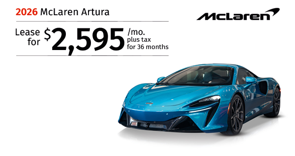 2026 McLaren Artura Coupe. Stock #TW003975. MSRP $301,600. $2,595/mo. plus tax 36 months lease. $ Rebate. $30,172 Total due. Includes down payment, tax, first payment, tag, acquisition fees, dealer fee, and dealer installed options, if any. $0 security deposit. Lease...Request More Info