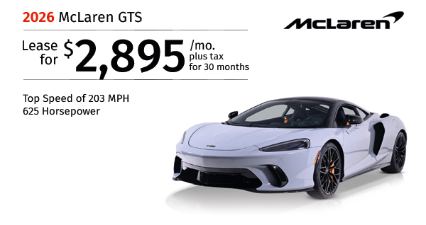 2026 McLaren GTS . Stock #TW003544. MSRP $251,728. $2,895/mo. plus tax 36 months lease. $30,493 Total due. Includes down payment, tax, first payment, tag, acquisition fees, dealer fee, and dealer installed options, if any. $0 security deposit. Lease end value...Request More Info